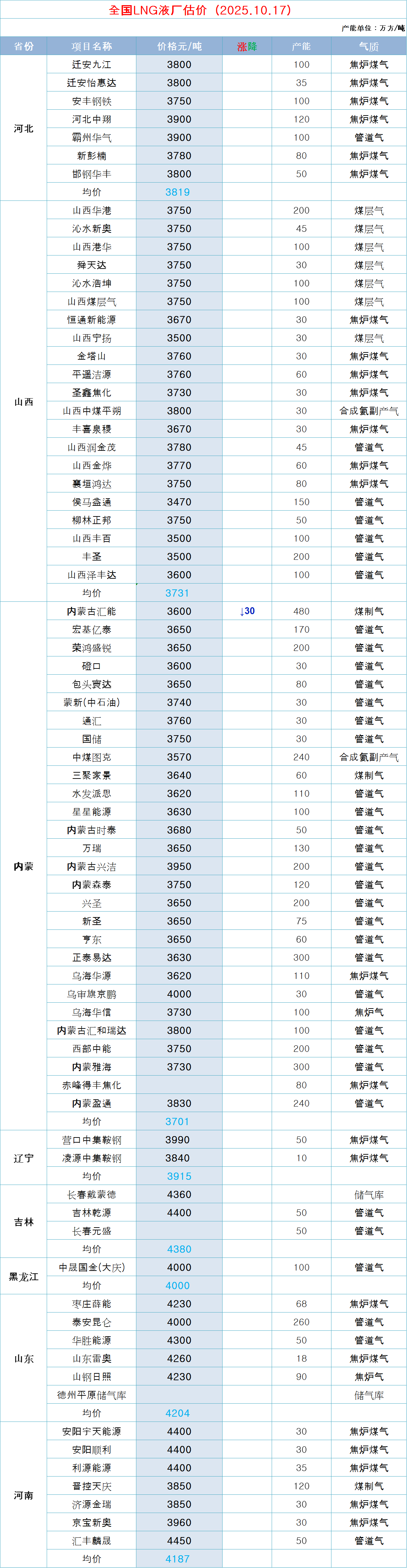 LNG天然气每日价格
