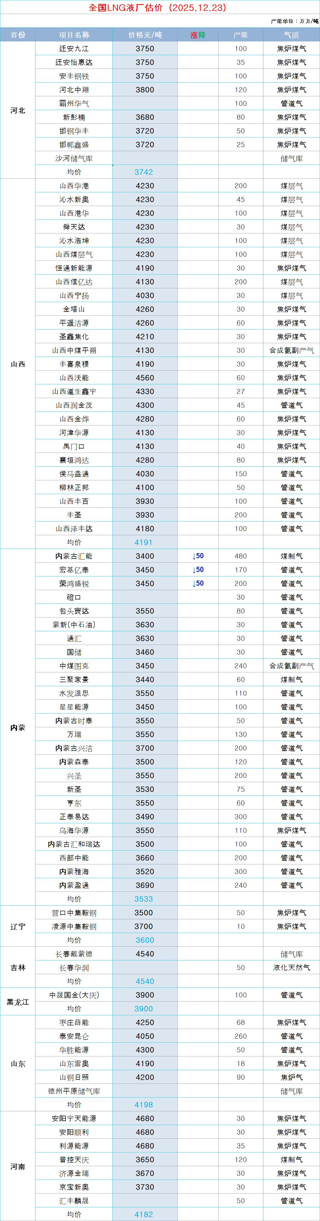 LNG天然气每日价格